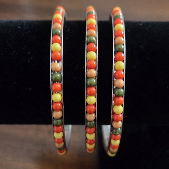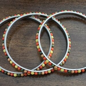 Vibrant bangle set featuring multicolored beads. Perfect for adding a pop of color to any outfit.
