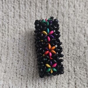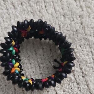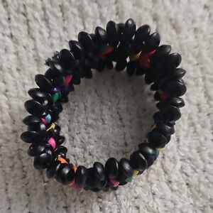 Vibrant beaded bracelet with black, red, orange, yellow, green, and purple beads. Perfect for adding a pop of color.