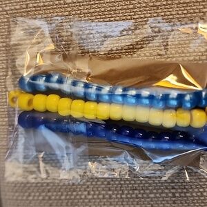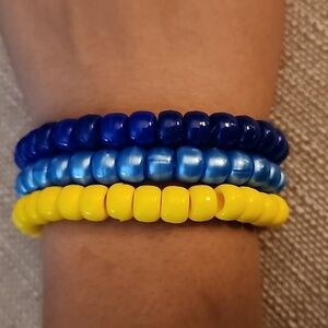 Brighten up your outfit with this vibrant beaded bracelet set. Featuring cheerful yellow and bold blue beads, these accessories are perfect for adding a pop of color to any look.