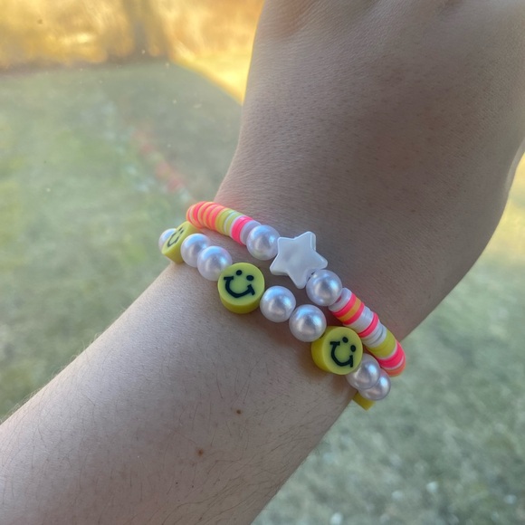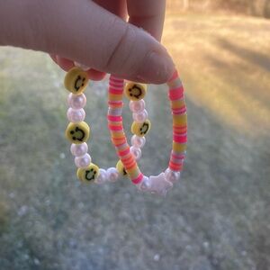 Brighten up your day with this colorful handmade beaded bracelet set. Featuring vibrant yellow smiley faces and a mix of pink, yellow, and white beads, these accessories are perfect for any occasion.