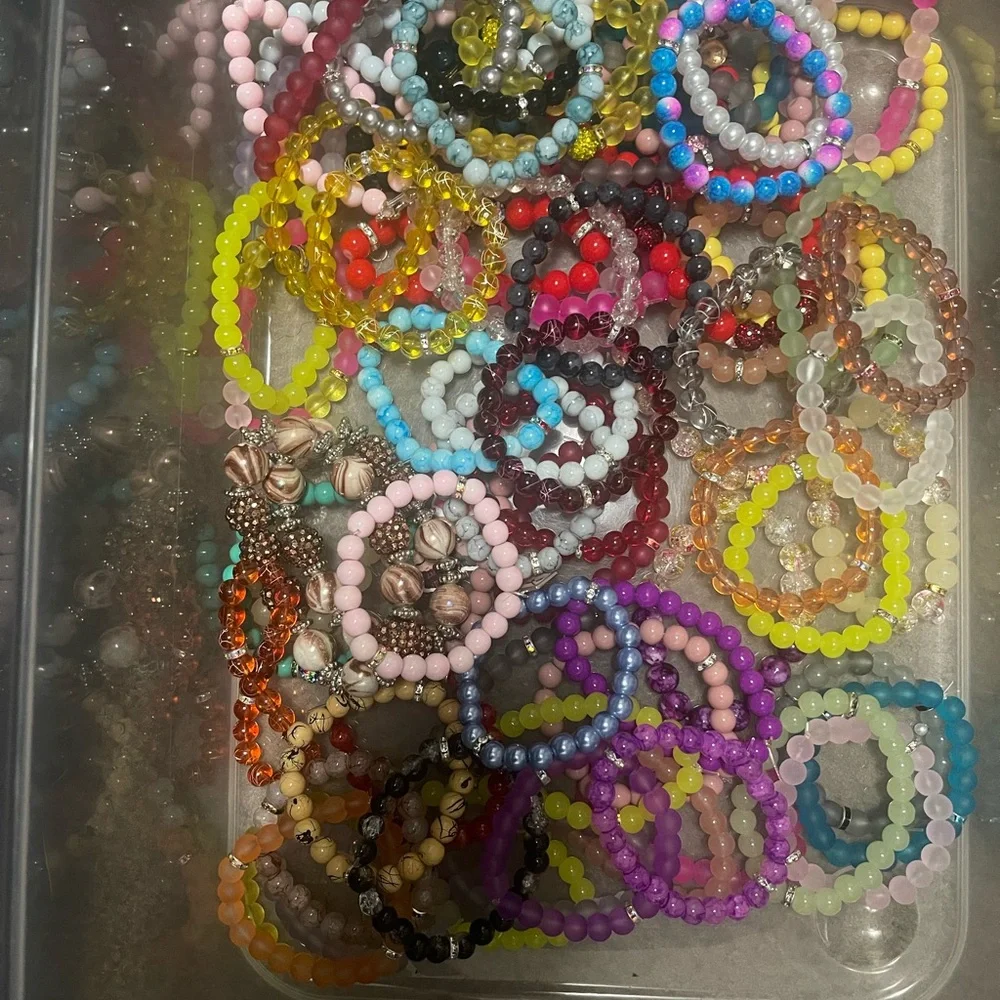 Vibrant set of beaded bracelets in various colors. Perfect for adding a pop of color to any outfit.