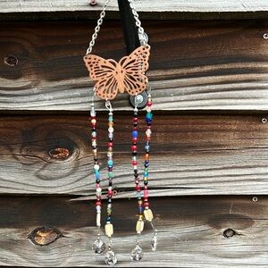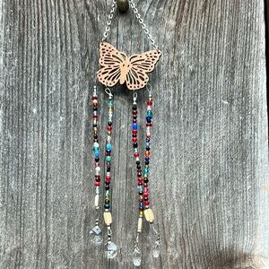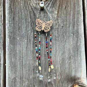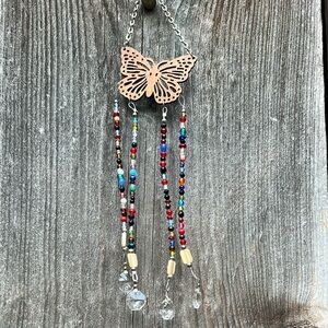 Beautiful wind chime with a butterfly design. Features colorful beads and crystal accents. Perfect for adding charm to any space.