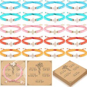 Features: This set includes 20 vibrant Christian friendship bracelets, 20 kraft Christian cards, and 100 opp bags—great for church groups, gifts, or just sharing love. The bracelets are made with colorful polymer clay beads and feature a simple, stylish white cross design. They’re versatile, with a boho preppy vibe, making them suitable for everyday wear or special occasions like baptisms, communion, or church events. The sliding knot allows for a perfect, personalized fit, and the cheerful pastel palette adds a nice pop of color to any outfit.