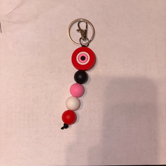 Vibrant keychain with red, pink, black, and white beads. Perfect for adding a pop of color to your keys.