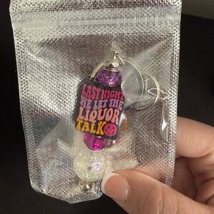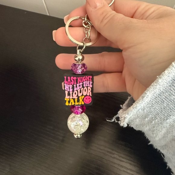Vibrant keychain featuring a playful quote. Includes pink and purple beads.