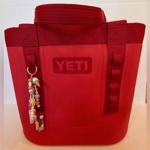 Add a pop of color to your bag with this homemade vibrant beaded keychain. Perfect for adding charm to your bag or keys. Styled on the YETI camino 35 bag!