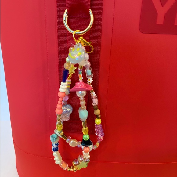 Add a pop of color to your bag with this homemade vibrant beaded keychain. Perfect for adding charm to your bag or keys. Styled on the YETI camino 35 bag!
