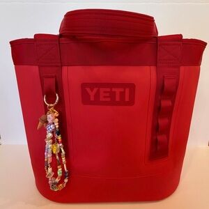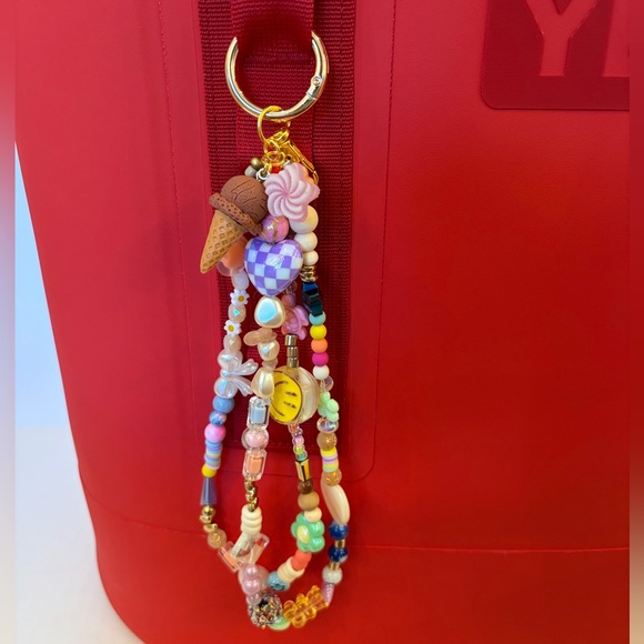 Add a pop of color to your bag with this homemade vibrant beaded keychain. Perfect for adding charm to your bag or keys. Styled on the YETI camino 35 bag!