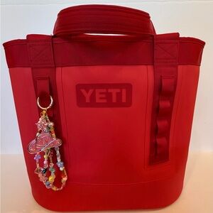 Add a pop of color to your bag with this homemade vibrant beaded keychain. Perfect for adding charm to your bag or keys. Styled on the YETI camino 35 bag!