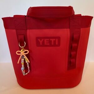 Add a pop of color to your bag with this homemade vibrant beaded keychain. Perfect for adding charm to your bag or keys. Styled on the YETI camino 35 bag!