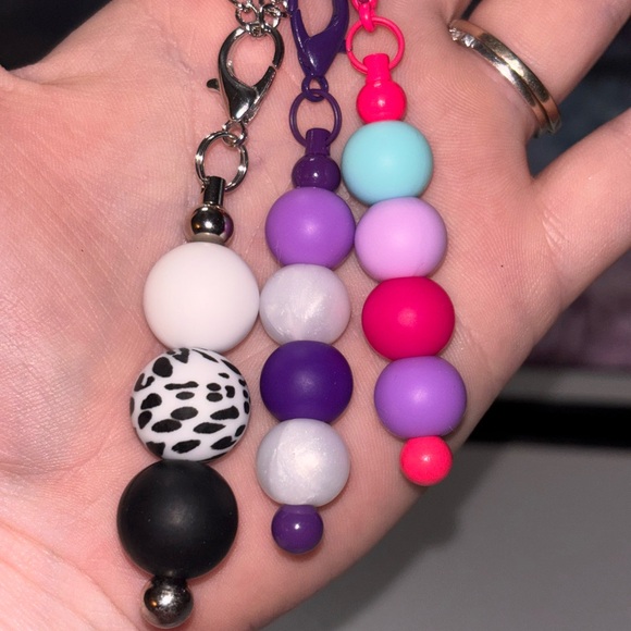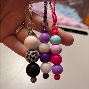 Set of three beaded keychains in vibrant colors. Features black, white, purple, pink, and blue beads. Perfect for adding a pop of color to your keys.