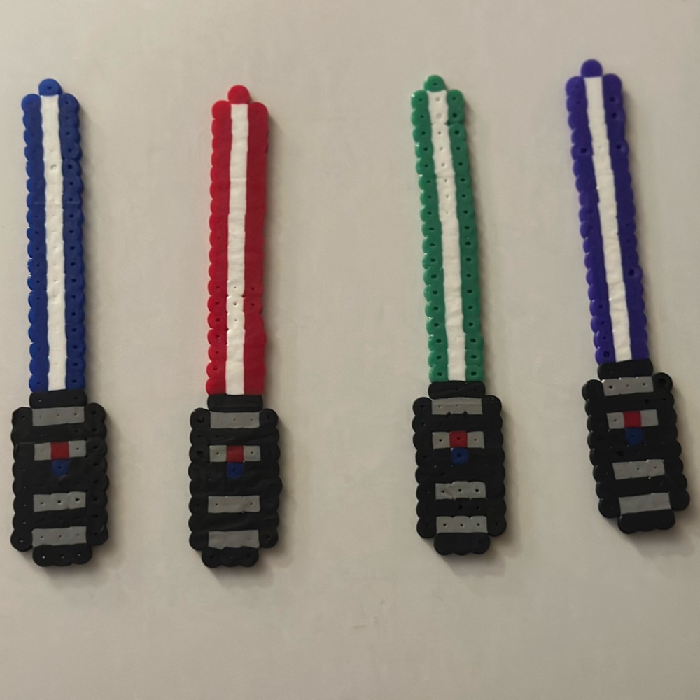 Set of four beaded keychains in black, blue, red, and green. Perfect for adding a pop of color to your keys.