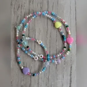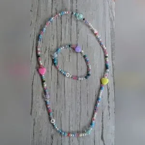 Brighten up your child's outfit with this colorful beaded necklace and matching bracelet. Featuring a playful mix of pink, blue, yellow, and white beads, it's perfect for adding a fun touch to any look.