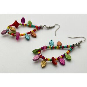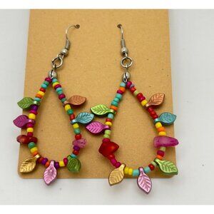 Handmade boho earrings featuring multicolor beads and leaf charms. Adds a vibrant touch to any outfit.