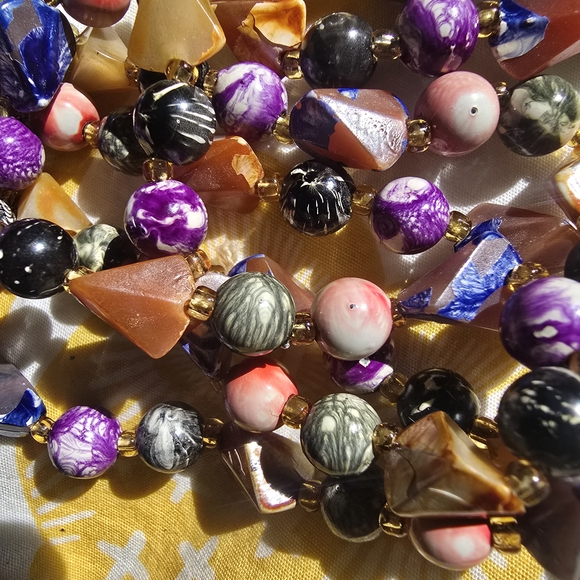 Vibrant and stylish, this colorful beaded necklace is perfect for adding a pop of color to any outfit. Featuring a mix of purple, pink, and gold beads, it's a must-have accessory for any jewelry collection.
