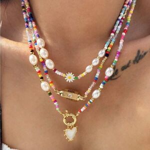 Add a pop of color to your outfit with this vibrant beaded necklace featuring a charming gold heart pendant. 18k gold plated waterproof. Perfect for any occasion.