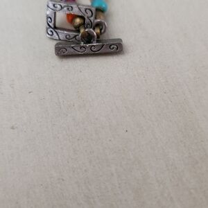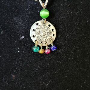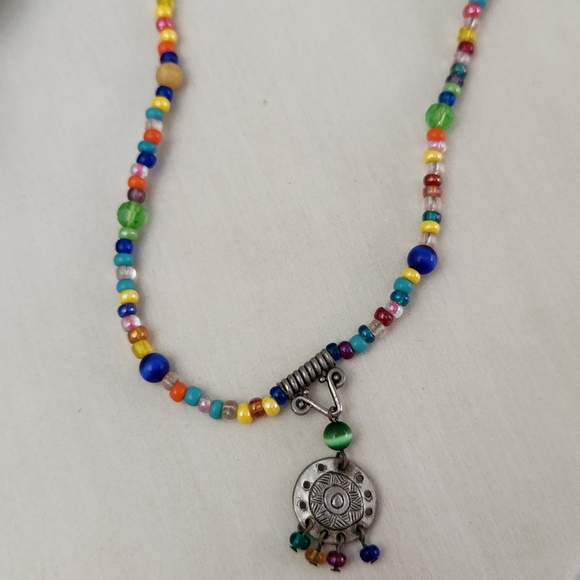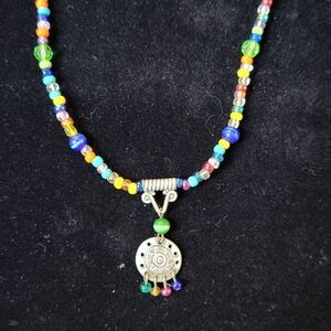 Add a pop of color to your outfit with this vibrant beaded necklace featuring a unique silver pendant. Perfect for any occasion. Fun necklace for a child or teen.