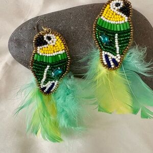 Vibrant parrot earrings with intricate beadwork and feather accents. Features yellow, green, and blue colors.