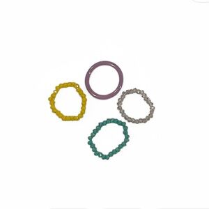 Set of four beaded rings in vibrant colors. Includes pink, yellow, silver, and teal rings. Perfect for adding a pop of color to any outfit.