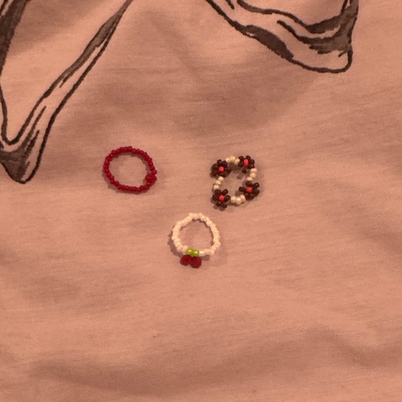Set of three beaded rings. Features red, white, black, and green beads. Perfect for adding a pop of color.