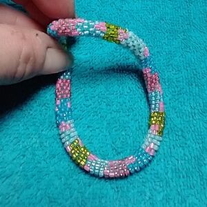 Vibrant beaded bracelet. Features pink, blue, and gold beads. Perfect for adding a pop of color.
