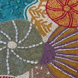 Vibrant beaded table runner with sea-inspired design.