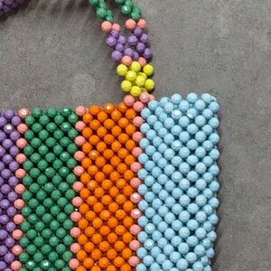 Vibrant and stylish, this beaded tote bag is perfect for adding a pop of color to any outfit. Featuring a playful mix of yellow, purple, green, orange, and blue beads, it's a must-have accessory for fashion-forward individuals.