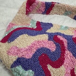 This vibrant beaded bag is perfect for adding a pop of color to any outfit. Featuring a unique blend of pink, purple, and cream, it's a stylish accessory for any occasion.