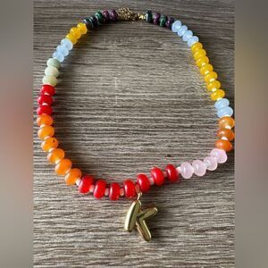 This vibrant necklace features a stunning array of colorful beads, complemented by a gold charm letter K . Perfect for adding a pop of color to any outfit.