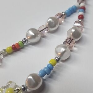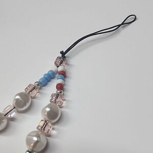 Vibrant phone charm with mixed beads and pearls. Features floral accents. Perfect for adding a pop of color.