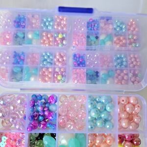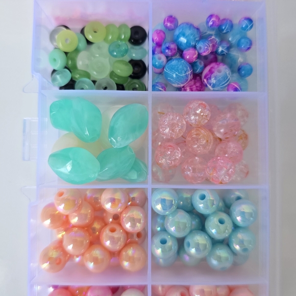 Assorted beads in a clear organizer. Includes green, pink, blue, and black beads. Perfect for crafting.