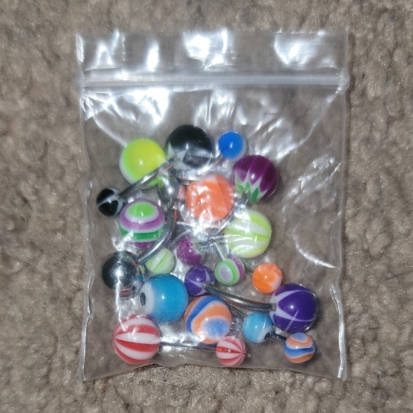 11 vibrant belly button rings with various colors including green, black, blue, purple, and orange. Perfect for adding a pop of color to your style.