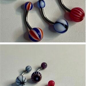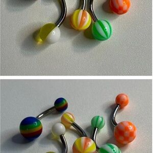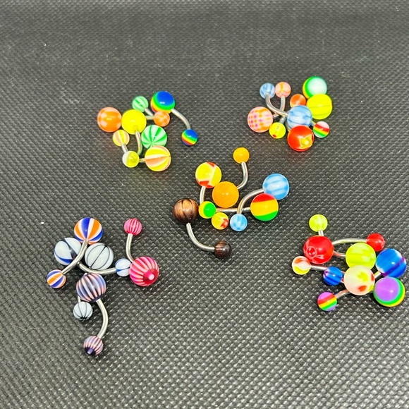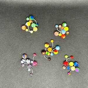 Vibrant set of belly button rings. Features various colorful designs. Perfect for adding a pop of color.