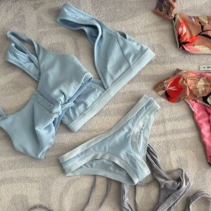 Vibrant bikini set collection featuring floral, yellow, blue, and gray designs. Perfect for a stylish beach day. Brands: risk, bodyglove, bikini lab, vetchy, shore. Xs / s - as is.
