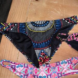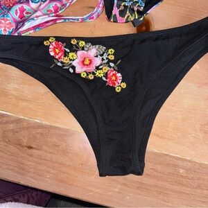Set of four bikini bottoms in vibrant patterns. Includes black with embroidery, multicolor geometric, and abstract designs. Brand from ASOS, H&M & Bar III Sz from 4/6, S/M
