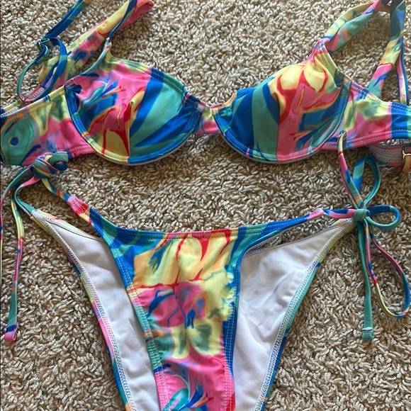 Vibrant bikini set with a multicolor pattern. Features adjustable straps and a stylish design.