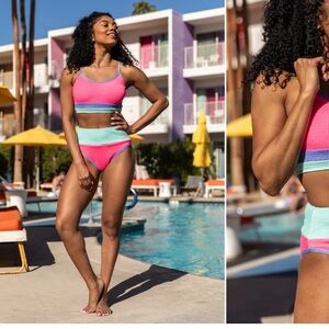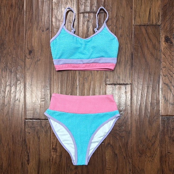 Vibrant bikini set with a mix of blue, pink, and purple. Perfect for a stylish beach day. New-has hygienic liner and was not tried on. Bought for my daughter but she’s not quite in women’s sizing yet.