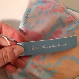 Stylish bikini set with a vibrant pattern. Features a mix of pastel colors. High waisted bottoms! Both top and bottoms are size medium in women's.