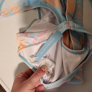 Very cute, tied dye swim suit. NEVER WORN, WITH THE TAGS ON IT!!! However, it did come with a small mark on the bottoms. You can't notice it unless you are looking for it.