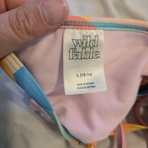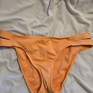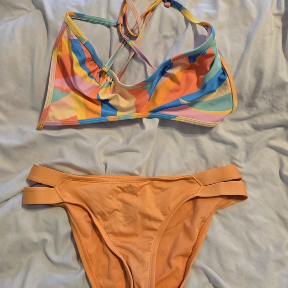 Vibrant bikini set with a colorful top and orange bottoms. Perfect for a beach day. Top and Bottom are different brands and sizes.