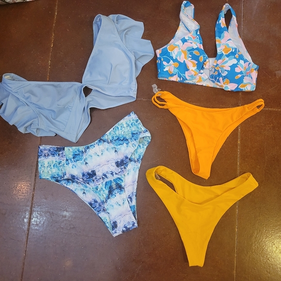 Vibrant bikini set with various colors. Includes blue, orange, and multicolor pieces. Perfect for a stylish beach day.