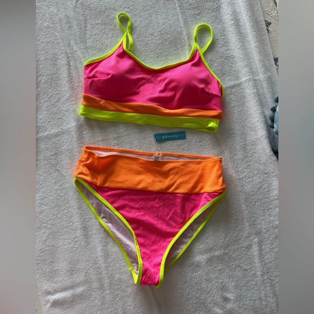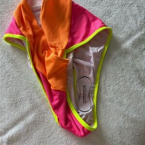 Vibrant bikini set featuring a striking combination of pink and orange with neon green accents. Perfect for making a statement at the beach or pool.
