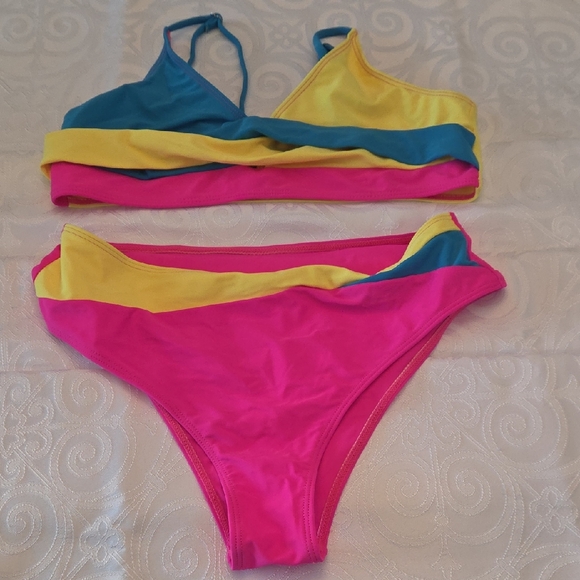 Vibrant bikini set with pink, yellow, and blue colors. Perfect for a fun day at the beach.