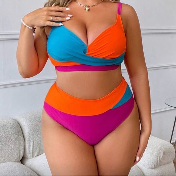 Vibrant bikini set with orange, blue, and purple panels. Stylish and eye-catching design. Never been worn