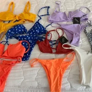 Deal on 5 full sets plus two bonus bikini bottoms!! All NWT. Diverse bikini set featuring vibrant colors like yellow, purple, blue, red, orange, and white. Double lined tops and bottoms. All tops (except rust-colored triangle top) have removable bra pads.