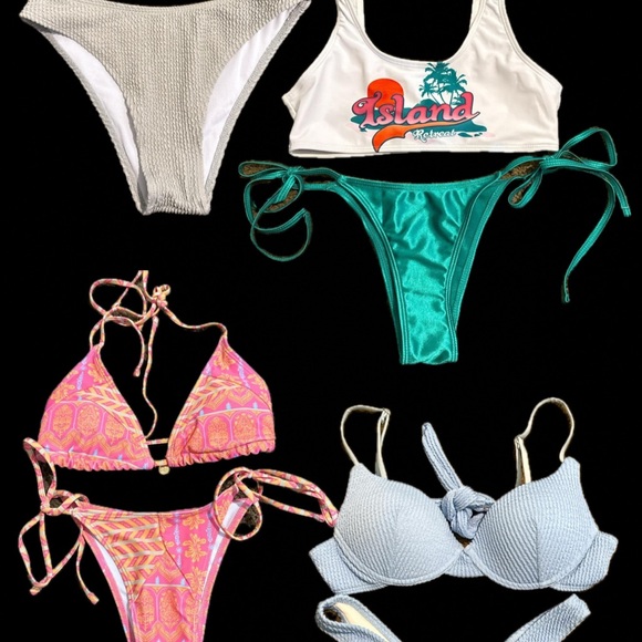 4 pack bundle Vibrant bikini set collection featuring multiple styles and colors. Includes pink, teal, and cream designs.