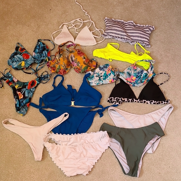 A vibrant collection of bikinis featuring various colors and patterns. Perfect for a stylish beach day.