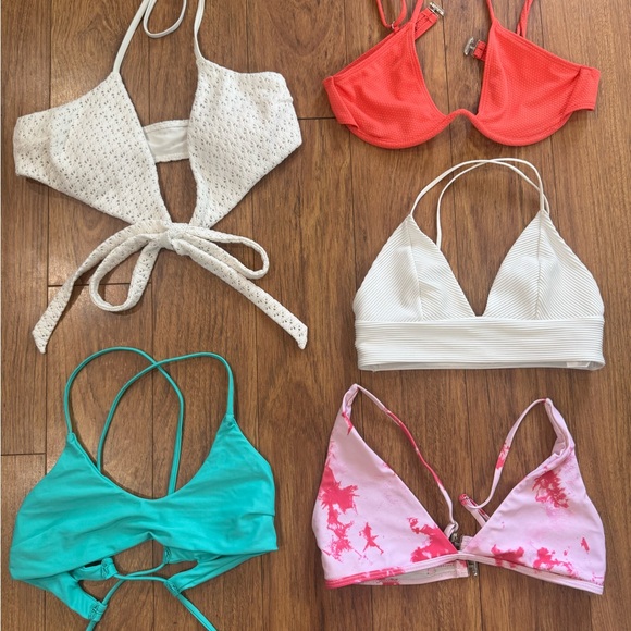 Set of five bikini tops in various colors. Includes white, red, teal, and pink designs. Perfect for mix and match beachwear.