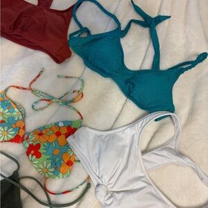 A vibrant collection of bikini tops in various colors and patterns. Perfect for mixing and matching at the beach.