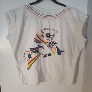 This charming kids top features a vibrant bird embroidery, perfect for adding a splash of color to any outfit. The white base makes it versatile and easy to pair with other items. Ideal for playful days and special occasions alike.